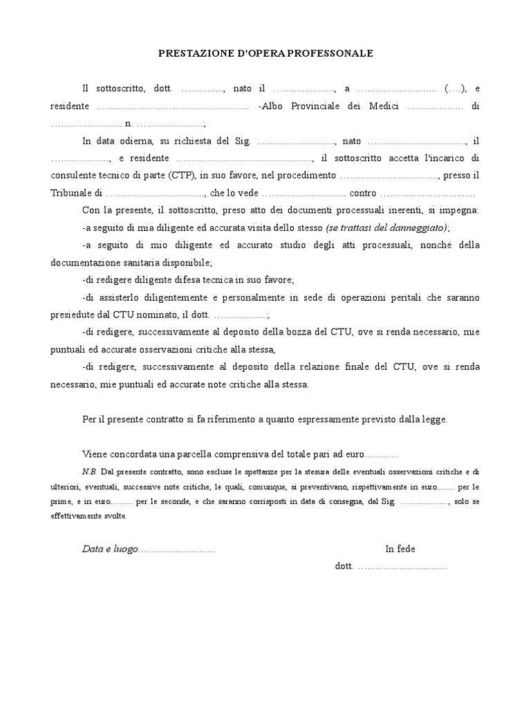 Fac Simile Atto Di Conferimento Incarico Professionale Al Psicologo Con ... Il Professionista s'impegna ad eseguire l'incarico applicando il seguente modello teorico e la seguente metodologia……................................ Gli incontri avranno frequenza …………………… nei giorni di …………… La durata (anche solo indicativa) di ciascun incontro sarà pari a …………………… CTP, la lettera di incarico professionale e il compenso per l ... L'incarico di CTP (Consulente Tecnico di Parte) è un incarico personale che il Professionista riceve o su proposta della Parte o del Legale. Il CTP risponde ...