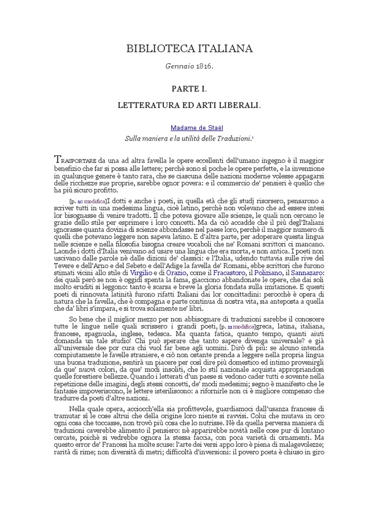 Madame de stael lettera. Madame de Staël, La traduzione ... - StuDocu L'articolo creò grande scalpore nei circoli letterari italiani ed è considerato il punto di partenza della polemica tra classicisti e romantici in Italia, che sancisce l'inizio del Romanticismo nel nostro paese. Madame de Staël morì a Parigi nel 1817. far bene agli uomini 5. Dirò di più: se alcuno intenda compiutamente le favelle 6 straniere, e