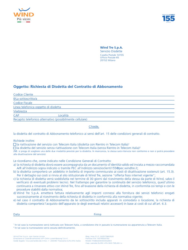 Lettera disdetta tim business. Recesso | TIM BUSINESS Qualora il Rappresentante Legale o il Titolare del contratto intenda recedere dal contratto e/o dall'offerta/opzione, potrà comunicarlo a TIM, nei termini indicati nelle specifiche Condizioni Generali, tramite le modalità successivamente indicate. Indicare il contratto e/o l'offerta/opzione da cui si intende recedere. Disdetta contratto Tim o Telecom: ecco come fare Un'altra possibilità per inoltrare una disdetta Tim business è di procedere attraverso l'Area Clienti Online della TIM, collegandosi al sito e loggandosi, scaricando il modulo e compilandolo. L'invio può essere effettuato sempre nell'area riservata o tramite PEC. Dove inviare la disdetta Tim mobile Disdetta TIM Business: modello WORD, PDF e istruzioni Disdetta Tim Business tramite PEC Visto che gran parte di aziende e professionisti dispongono di una PEC, per loro c'è la possibilità di comunicare la disdetta anche attraverso questa modalità. Nella fattispecie la comunicazione va inoltrata all'indirizzo telecomitalia@pec.telecomitalia.it dai Professionisti e dai clienti con Partita IVA Disdetta TIM Business 2023 - Guida e Fac Simile Segui i passaggi che ti verranno indicati dalla voce registrata per parlare con un operatore TIM, al quale dovrai indicare in maniera esplicita la tua volontà di recedere dal contratto Tim Business in essere. Potrai richiedere all'operatore di farti inviare via mail il modulo per il recesso.