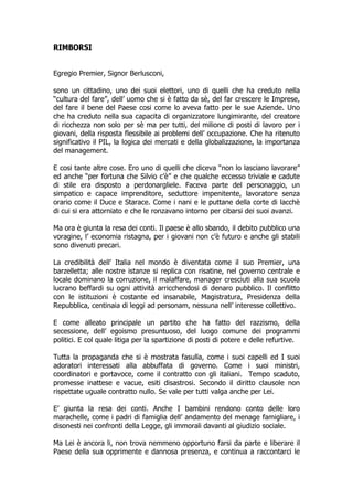 Se scrivo una lettera al presidente Berlusconi lui la legge? Salvo Longo L'autore ha scritto 1 lettera, clicca salvo56 per dettagli sulla pubblicazione. Altre lettere sul tema Scrivo una lettere per il Presidente Silvio Berlusconi Scrivo una al Signor Presidente Silvio Berlusconi Lettera per il presidente Silvio Berlusconi Lettera al Sig. Egregio Presidente Berlusconi