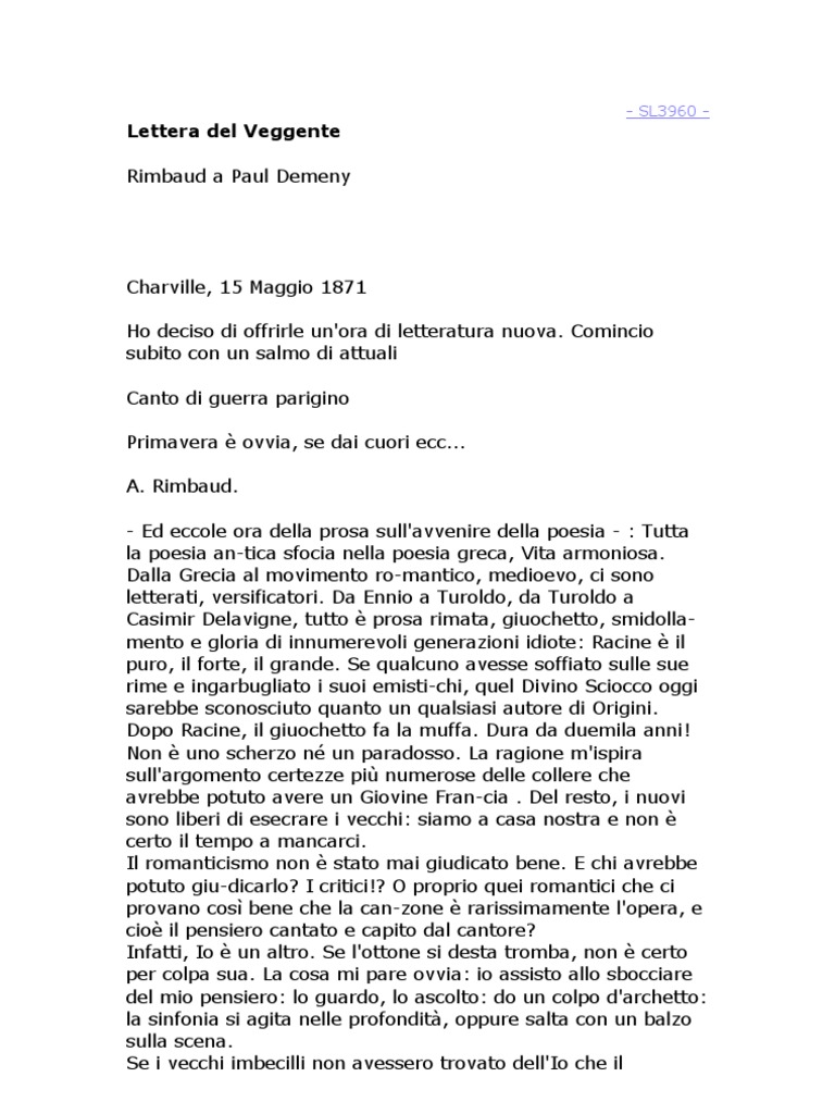 Lettera del Veggente - Wikipedia La lettera cosiddetta "del Veggente" (in francese Lettre du Voyant) è la missiva inviata dal poeta Arthur Rimbaud all'amico Paul Demeny il 15 maggio del 1871, considerata il primo vero manifesto dei movimenti d' avanguardia letteraria e della poesia moderna. Lettera del Veggente - Un Poeta Maledetto La Lettera del Veggente (come ribattezzata dalla critica) è — per usare le parole di R. Gilbert-Lecomte — «il momento che consegna la vita di Rimbaud alla sua sovrumana esperienza. È un elemento grezzo, indicibilmente prezioso. Lettera Del Veggente - Rimbaud (15 Maggio 1871) | PDF A. Rimbaud. - Ed eccole ora della prosa sull'avvenire della poesia - : Tutta la poesia an-tica sfocia nella poesia greca, Vita armoniosa. Dalla Grecia al movimento ro-mantico, medioevo, ci sono letterati, versificatori. Da Ennio a Turoldo, da Turoldo a Casimir Delavigne, tutto prosa rimata, giuochetto, smidollamento e gloria di innumerevoli ...